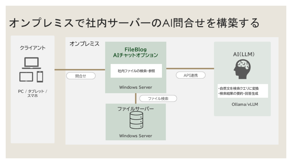 独自開発したAIエージェントをFileBlogに実装することで、生成AIを活用した対話形式の社内ファイルサーバ検索、検索結果の要約などの情報活用、検索結果に基づいた質問応答が可能になります。